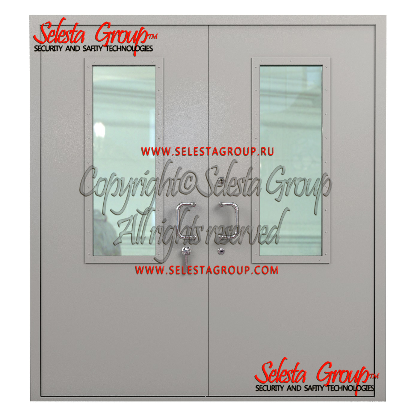 Дверь бронированная пулестойкая двупольная серии ДБПД-4/AG-2, 4 класса пулестойкости по ГОСТ Р 51112-97 с остеклением бронестеклом AG-2 по ГОСТ Р 51136-2008.